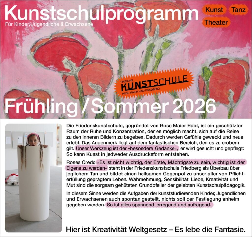 Die Friedenskunstschule, gegründet von Rose Maier Haid, ist ein geschützter Raum der Ruhe und Konzentration, der es möglich macht, sich auf die Reise zu den inneren Bildern zu begeben. Dadurch werden Gefühle geweckt und neue erlebt. Das Augenmerk liegt auf dem fantastischen Bereich, den es zu erobern gilt. Unser Werkzeug ist der »besondere Gedanke«, er wird gesucht und gepflegt: So kann Kunst in jedweder Ausdrucksform entstehen.