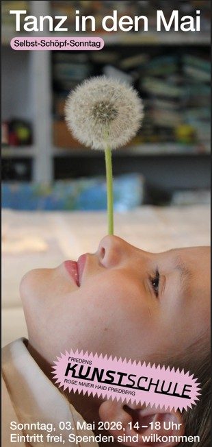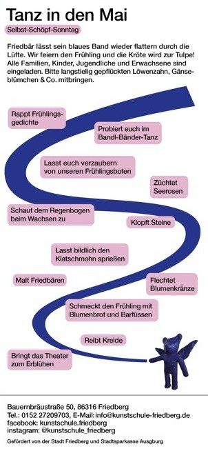Unser Tanz in den Mai lässt der Fantasie an zahlreichen Kunstarbeitsplätzen freien Lauf: Probiert euch aus im Bandl-Bänder-Tanz, rappt Frühlingsgedichte, lasst bildlich den Klatschmohn sprießen, bringt die Theaterbühne zum Erblühen, flechtet Blumenkränze, malt Friedbären, klopft Steine, reibt Kreide, schaut dem Regenbogen beim Wachsen zu, züchtet Seerosen oder schmeckt den Frühling mit Blumenbrot und Barfüssen.