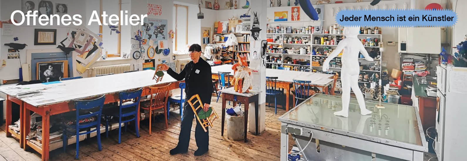 Im Sinne der Sozialen Plastik bietet das Offene Atelier Erwachsenen einen Raum, ihre Gedanken und Werke in der kreativen Atmosphäre der Kunstschule aus sich selbst schöpfend zu bearbeiten, denn: Jeder Mensch ist ein Künstler. Wie oft man das Atelier zu seinen Öffnungszeiten besucht, ist dank der 10xATELIERKarte (gültig bis Juli 2026) rein der eigenen Muse geschuldet. Grundlegende Kunstutensilien stehen zur Verfügung, Arbeitsmaterialien sind selbst mitzubringen.